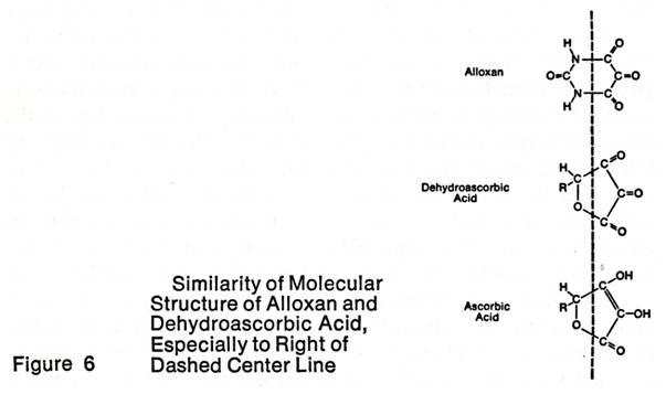 2. When ascorbic acid is oxidized, it forms dehydroascorbic acid, a compound similar in structure to alloxan. The structures of ascorbic acid, dehydroascorbic acid and alloxan are shown in Figure 6. One doesn't have to be a chemist to see the similarity between dehydroascorbic acid and alloxan structures to the right of the midline drawn through the molecule and the dissimilarity of ascorbic acid. The chemical properties of alloxan and dehydroascorbic acid are also strikingly similar, as noted by Patterson in 1950.